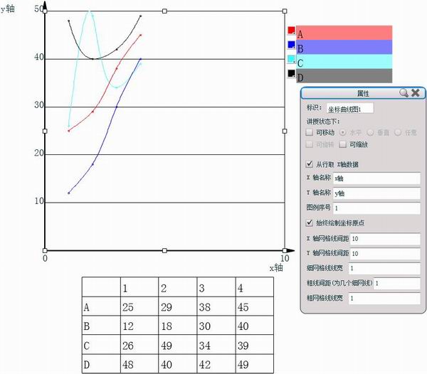 将鼠标光标移到表格中任一格,右键单击调出右键菜单,点击生成坐标曲线图功能,可自动根据表格中数据生成对应的坐标曲线图。右键单击坐标图,选择属性,可以对坐标的坐标轴、网格间距、线条等做相应的设置。