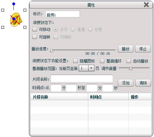 当讲授页面中有音频对象时,可以双击音频文件切换播放或暂停,点击旁边片段按钮自动播放对应按钮名字的音频片段,双击音频对象停止。