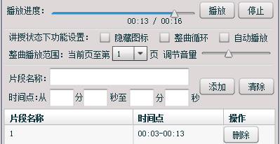 (4)单击“添加”按钮添加音频片段,该片段添加到片段列表中;单击“清除”按钮,清除未添加的片段信息(注:每为选中音频添加一个音频片段,在该音频右侧会自动添加一个以片段名命名的按钮,单击这个按钮可以播放对应片段。)