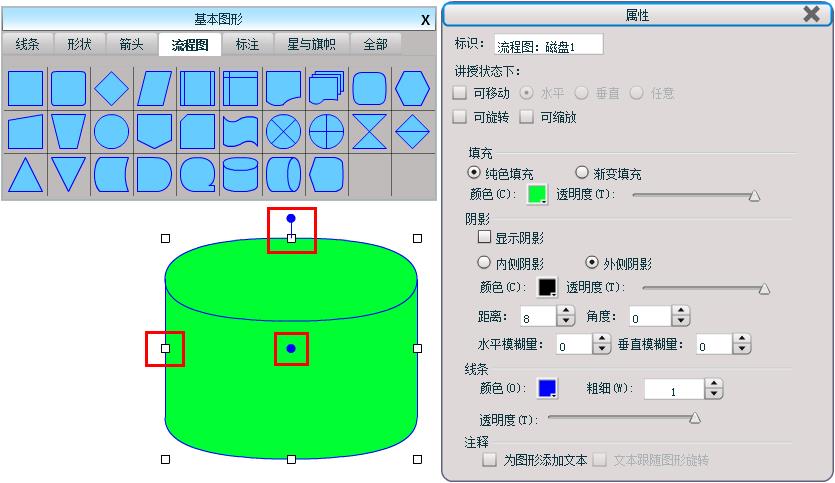 左键拖拽图形,可改变图形在页面上的位置;左键拖拽图形四边上的热键,可进行图形的大小放缩和上下、左右翻转;左键拖拽图形中央的蓝色热键,可以设置图形旋转中心的位置;左键拖拽图形上方蓝色热键,可以控制图形的旋转角度。