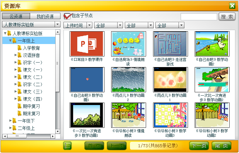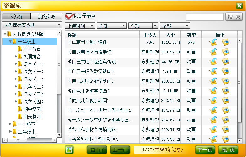 在登录状态下,可查看资源库中的资源。根据用户的需要,可随时切换成云版资源库中的公用资源和本人上传的私有资源,即“云资源”和“我的资源”。单击“人教课标实验版”右侧的下拉箭头,可进行教材版本的切换;可点击左侧小三角展开目录结构按照知识节点进行查看,也可通过勾选右侧“包含子节点”查看任一节点下的资源。