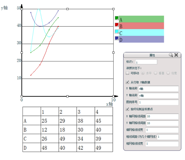 选中表格,鼠标右键单击调出『右键菜单』,点击『生成坐标曲线图』,可自动根据表格中数据生成对应的坐标曲线图,直观的看到数据的变化。在生成的坐标曲线图上单击右键,通过『右键菜单』调出『属性』对话框,可以设置坐标曲线图属性。