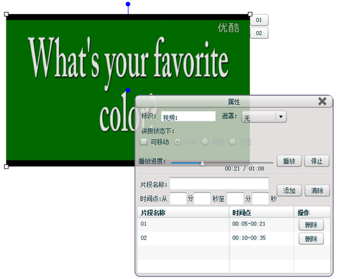 针对这样的问题,小学英语教学平台专门研发了可方便解决此问题的音视频编辑工具。教师可以通过右键调出音视频的属性面板,在播放音视频的同时添加所需要的音视频片段。
