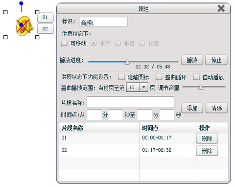 除了以上功能,对于音频文件,还可以通过右键菜单调出音频的属性对话框,设置在讲授状态下音频图标的隐显、是否整曲循环播放、是否自动播放和调整音频播放的音量。