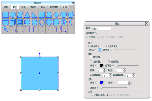 鼠标右键单击图形,通过『右键菜单』中的『属性』功能,可以改变图形的填充效果(颜色和透明度)、阴影(是否显示、位置、颜色、距离和模糊量)、线条(颜色、粗细和透明度)、箭头样式及注释(是否为图形添加文本及文本是否跟随图形旋转)等属性。(注:只有勾选"为图形添加文本"后,同时选中图形,才能进行"文本跟随图形旋转"的设置。)