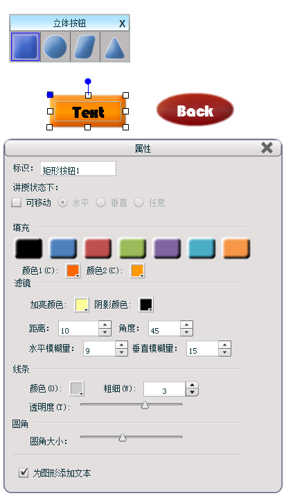 通过『属性』设置功能,还可改变按钮的填充颜色、滤镜效果、线条颜色和粗细、圆角大小及是否为图形添加文本等。