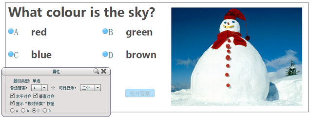 3.属性设置:在属性框中可设置备选答案的个数、每行显示的个数、是否水平或垂直对齐、正确答案和是否显示『核对答案』按钮。若设置显示『核对答案』按钮,在讲授状态下答题后,可判断对错,并显示正确答案(“对号”表示正确答案)。(注:在讲授状态下答题时,只有选中了某一个选项,才可以点击『核对答案』按钮判断答案正误。)