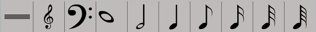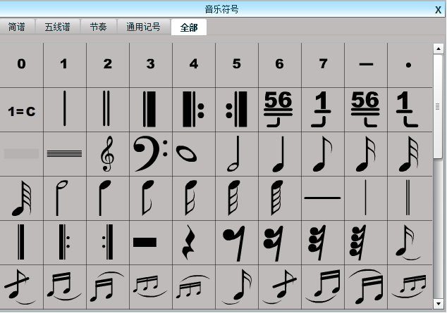 单击“音乐符号”按钮出现如下图所示的浮动框,点击分类名称对应标识,可看到此分类下的各种音乐符号。