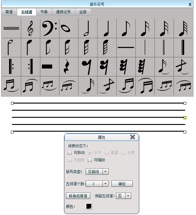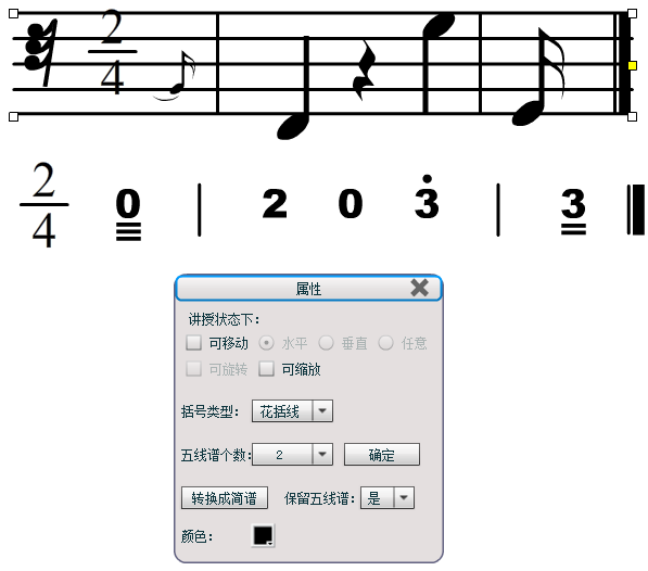 五线谱与简谱相互转换时,必须通过五线谱及简单编辑器来进行转换,(当不需简谱转换五线谱时,可不用简谱编辑器。)编辑器点击后根据四周方块进行大小可调,然后将编辑的音乐符号选择好后,放入编辑器中,大小会随编辑器调节后的大小,自动伸缩到相应比例大小,根据摆放音的高低,会自动吸附到指定位置。当确定好所有音符位置后,点五线谱编辑器(也就是五线谱外框),编辑好的音符会随着你拖动的编辑器一同拖动,成为一个整体,这时方可右键属性,点击转换成简谱。