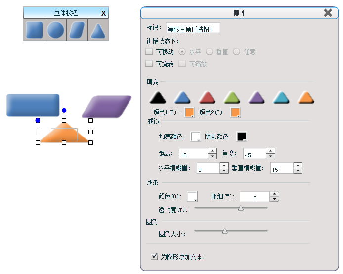 通过“属性”设置功能,可改变按钮的填充颜色、滤镜效果、线条颜色和粗细、圆角大小及文本是否添加。