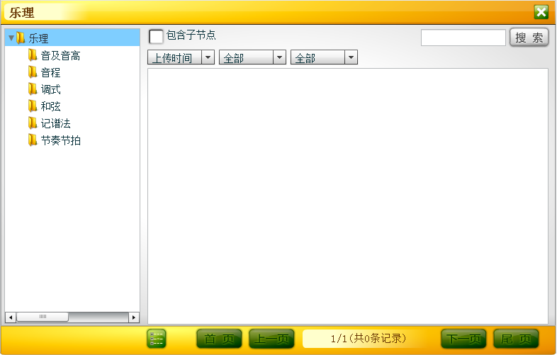 单击“乐理”按钮,弹出资源面板, 左侧是知识体系结构,右侧是资源列表。