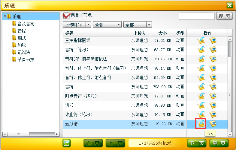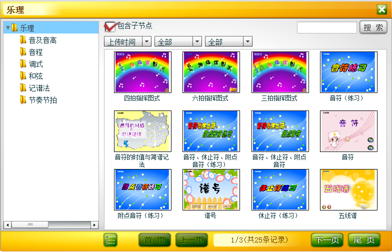 在登录状态下,可查看乐理库中的动画资源。可展开左侧目录结构按照知识节点进行查看,也可通过勾选右侧“包含子节点”查看任一节点下的动画资源。