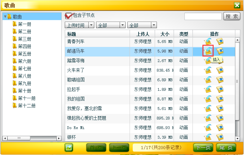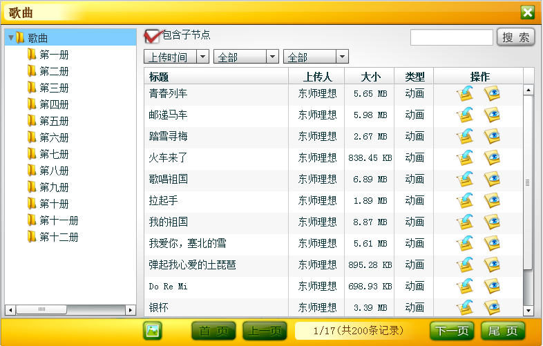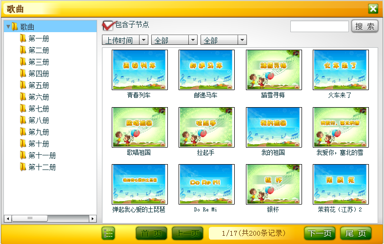 在登录状态下,可查看歌曲库中的动画资源。可展开左侧目录结构按照知识节点进行查看,也可通过勾选右侧“包含子节点”查看任一节点下的图片资源。